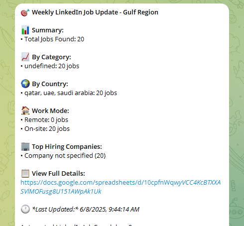 • Weekly Telegram Reports - Comprehensive summaries with job counts and top companies